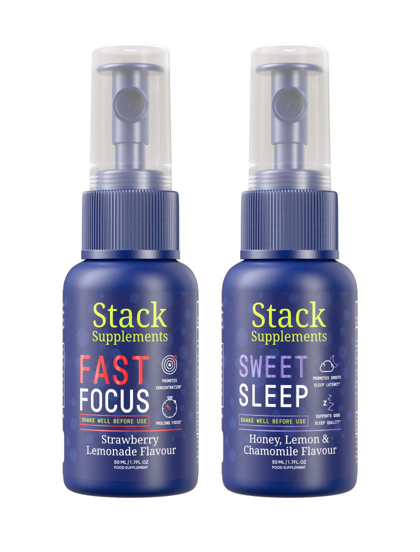 Elevate your daily protocol with this powerful stack. Our Fast Focus oral spray provides mental clarity and cognitive performance for peak productivity in the day, whilst our Sweet Sleep oral spray ensures a smooth, deep, restorative rest at night. Perfect for those striving to maximise their daytime focus and night-time recovery.