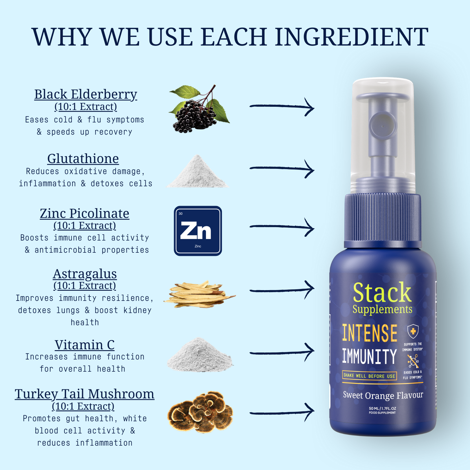 Active Ingredients: Black Elderberry Extract, Reduced Glutathione, Turkey Tail Mushroom Extract, Astragalus Root Extract, Vitamin C, Zinc.